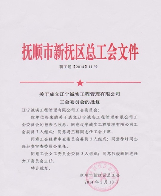 熱烈祝賀遼寧誠(chéng)實(shí)工程管理有限公司工會(huì)委員會(huì)成立
