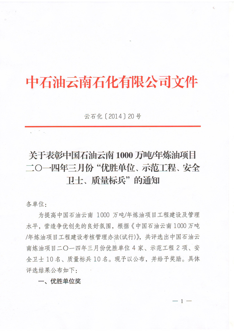 我公司榮獲中國石油云南1000萬噸/年煉油項目2014年3月份“優(yōu)勝單位”榮譽稱號!